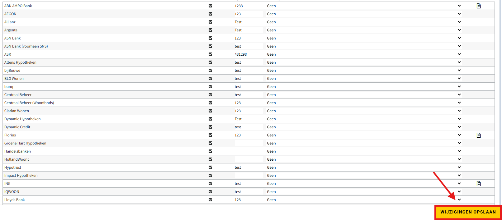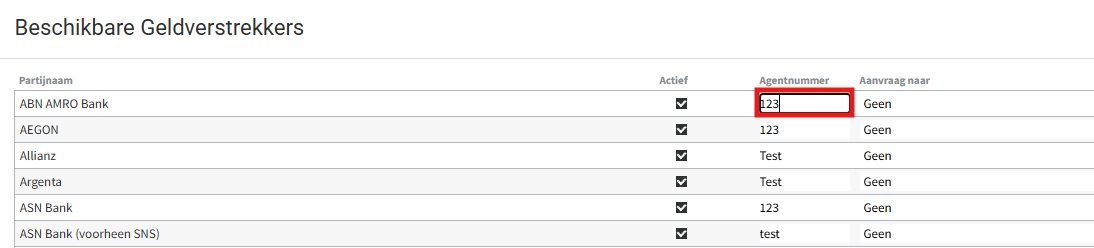 In de kolom ‘Agentnummer’ kun je per geldverstrekker een nummer invullen of aanpassen.
