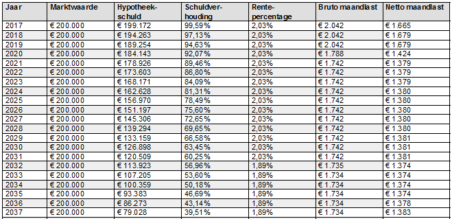 Daar staat een tabel met de schuld, schuldverhouding, rentepercentage en maandlast per jaar.