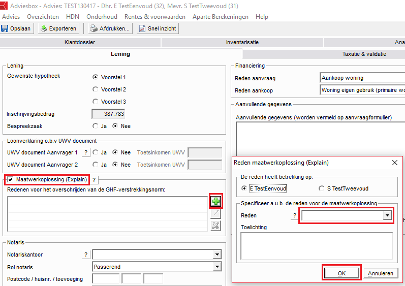 Bij het aanvragen van een lening is er een vinkje voor Maatwerk. Afhankelijk van de maatschappij (verstrekker) en de beschikbare opties, moet het vinkje wel of niet aangezet kunnen worden. Navigeer naar "Aanvraag" Ga in het systeem naar het ...