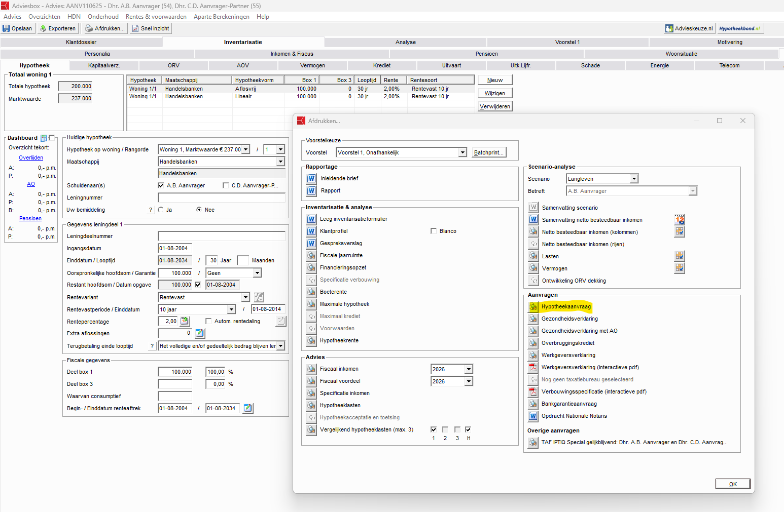 Na het invoeren vind je dan bij 'afdrukken' rechtsonder onder 'aanvragen' ook de hypotheekaanvraag zelf, die je dan als bijlage via de mail naar Handelsbank kunt sturen.