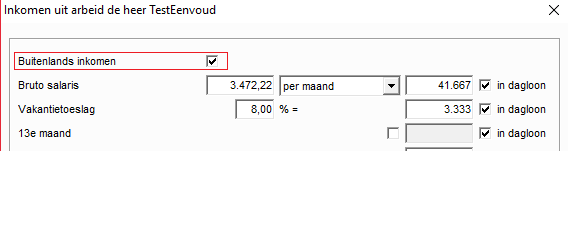 Inkomen & fiscus / Bruto salaris uit dienstverband /Verdiepingsknop blauw/ dit veld Buitenlands inkomen uitvinken.