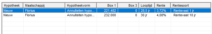 Ga naar Voorstel en kies "nieuw" en dan genereer een hypotheek. Er wordt een nieuw leningdeel gemaakt dat een voortzetting is van het bestaande leningdeel en een nieuw leningdeel (ivm uitkoop partner) met een looptijd van 30 jaar.