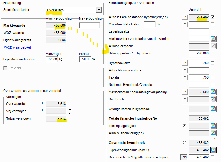 Ga naar Financieringsbehoefte. Uitkoop partner en voer het deel van de ex-partner + eventuele overwaarde in. Dit is normaal gesproken 50% van de marktwaarde oftewel de overwaarde + restschuld.