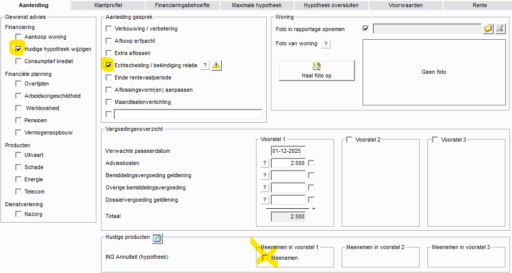 Ga naar Analyse/Aanleiding en vink meenemen van de hypotheek uit. Geef hier aan als aanleiding "echtscheiding/ beëindiging relatie".