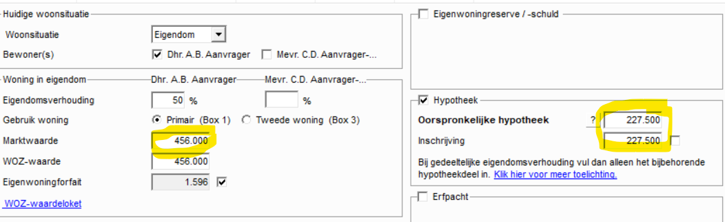 Ga naar Woonsituatie en geef aan wat de eigendomsverhouding is (meestal 50%) en pas de oorspronkelijke hypotheek aan, meestal de helft van de totale hypotheek.