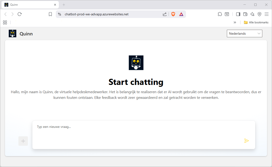 Voer een vraag in het tekstveld in en druk op de Entertoets om een antwoord van de virtuele assistent (Quinn) te ontvangen.