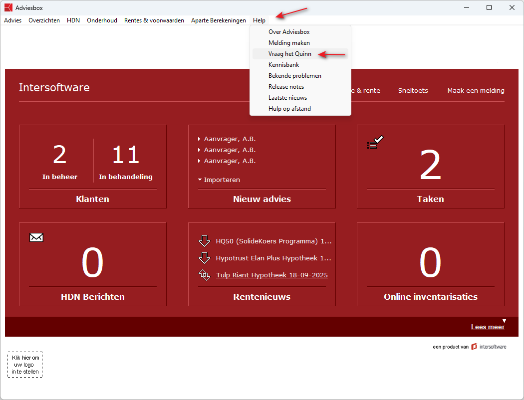 Navigeer in Adviesbox naar het menu Help en kies vervolgens voor Vraag het aan Quinn om ondersteuning van de virtuele assistent te krijgen.